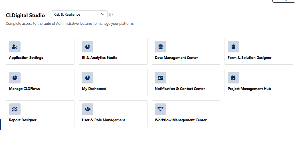 As an admin, you have full access to CLDigital Studio, where you can manage users, permissions, workflows, forms, reports, data integrations, branding, notifications, and all without writing code.
